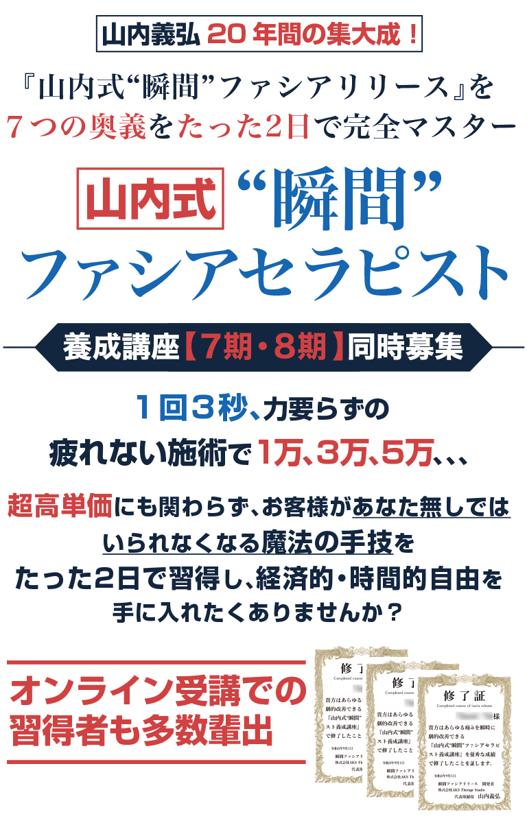 今回、これまで20年以上にわたり、身体のありとあらゆる不調を改善してきた、私、山内義弘が20年かけて開発・改良してきた山内式“瞬間”ファシアリリースをたった2日で身につけ、翌日からすぐに実践できるようになる山内式“瞬間”ファシアセラピスト養成講座を開催します。