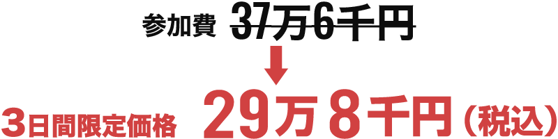 | 参加費 | 3日間限価格:29万8千円(税込) ※3日を過ぎると通常価格37万6千円(税込)でのご案内になります |